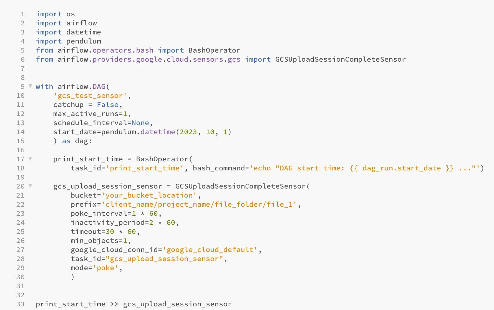 GCSUploadSessionCompleteSensor(: specifies that the task will use a GCSUploadSessionSensor to look for a file called ‘file_1’.