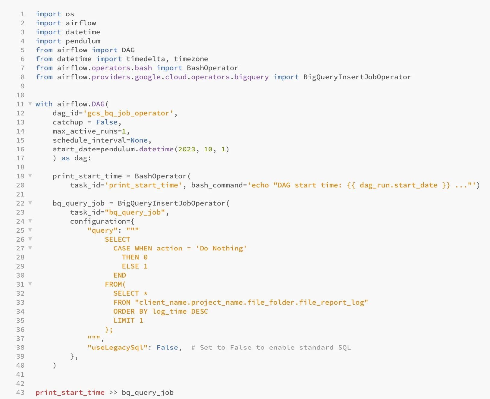 BigQueryInsertJobOperator() - Next, we tried a different operator to run our query. This task executes a SQL query against a Google BigQuery dataset, waits for the job to complete and returns a job id. The primary functionality of this operator is to initiate and monitor the execution of a BigQuery job, providing a streamlined approach to interact with Google BigQuery from within your DAG. This approach, however, did not work for our needs. We got attribute and environment related errors when running our query.