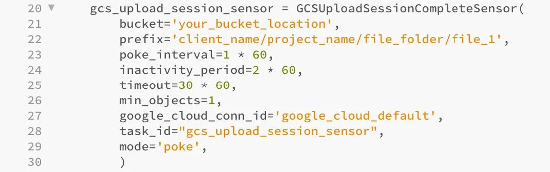 GCSUploadSessionCompleteSensor() - We then switched the process to check for a file in a folder that would be created if the same process above was successful. This task creates a sensor that monitors a GCS upload session, waiting for a specific file to be uploaded before allowing the DAG to proceed. Sensors are commonly used to ensure data availability before downstream tasks begin processing. We encountered issues with this sensor, which returns True if the inactivity period has passed with no increase in the number of objects in the bucket. The min_objects feature was set to 1, but it kept succeeding while the test_prefix pointed at the empty folder before the file was uploaded.