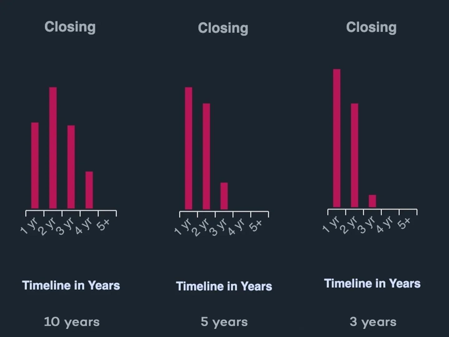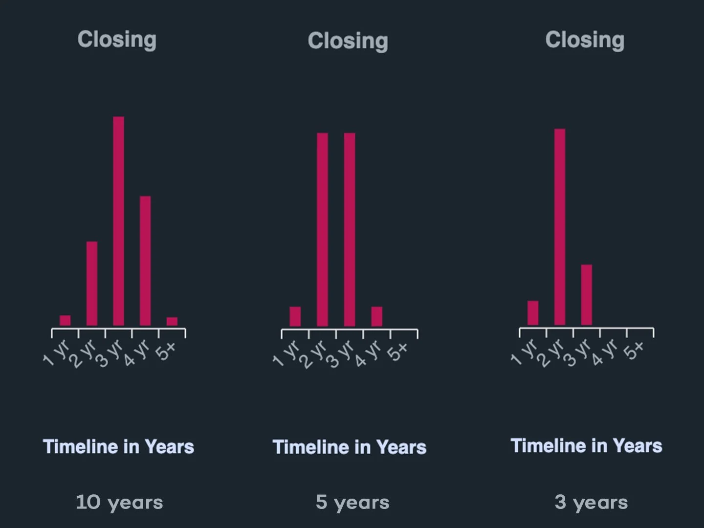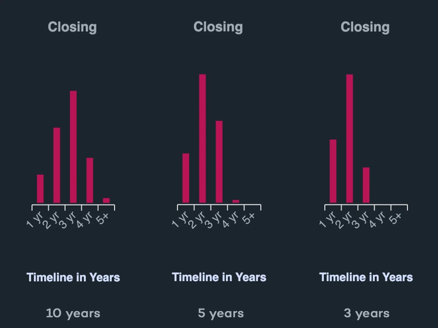 Our data science team pulled a simple view for one of our clients. It shows closing timeline distributions across 10 years, 5 years, and 3 years, split across three segments: